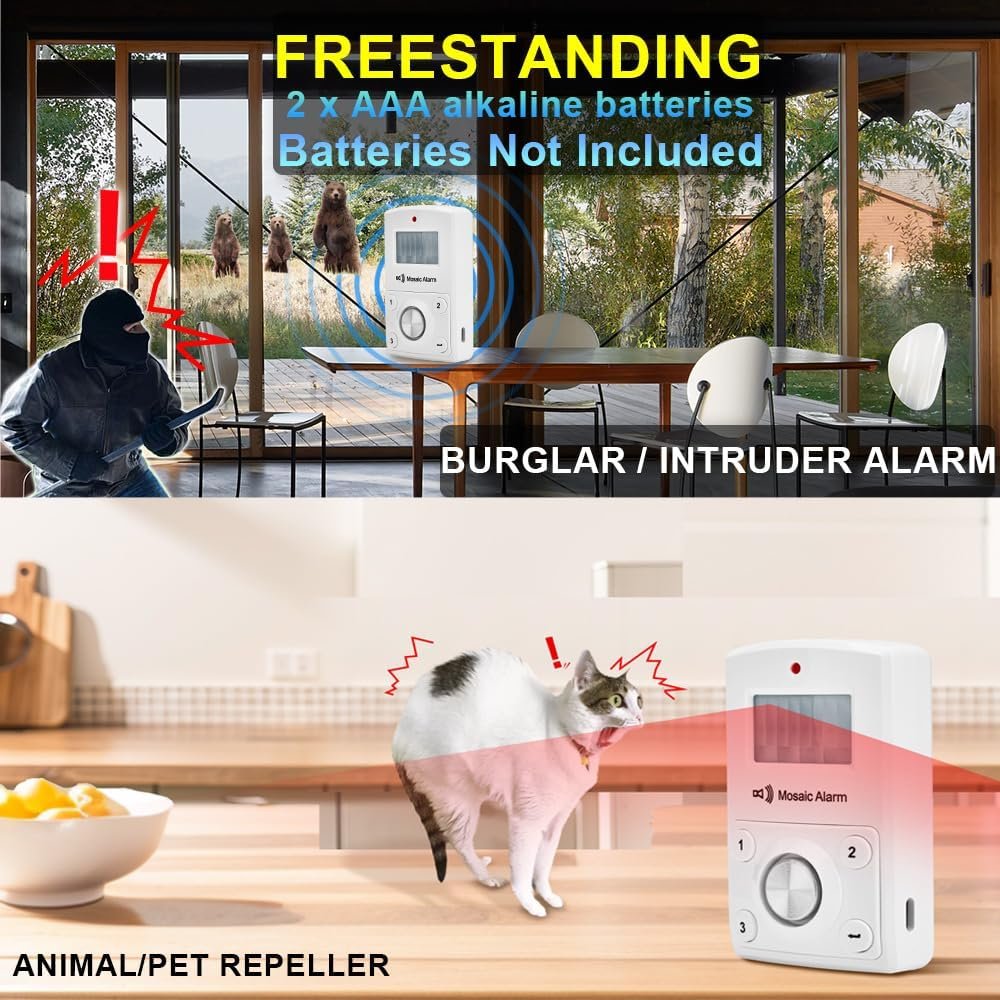 【Freestanding Travel Camp Bear Alarm】Using as Large Animals Repeller(NOT FOR SMALL ANIMALS). But you can still use it to keep dogs from destroying the furnitures or even keep cats/pets off kitchen counters and tables at short range when you are away.