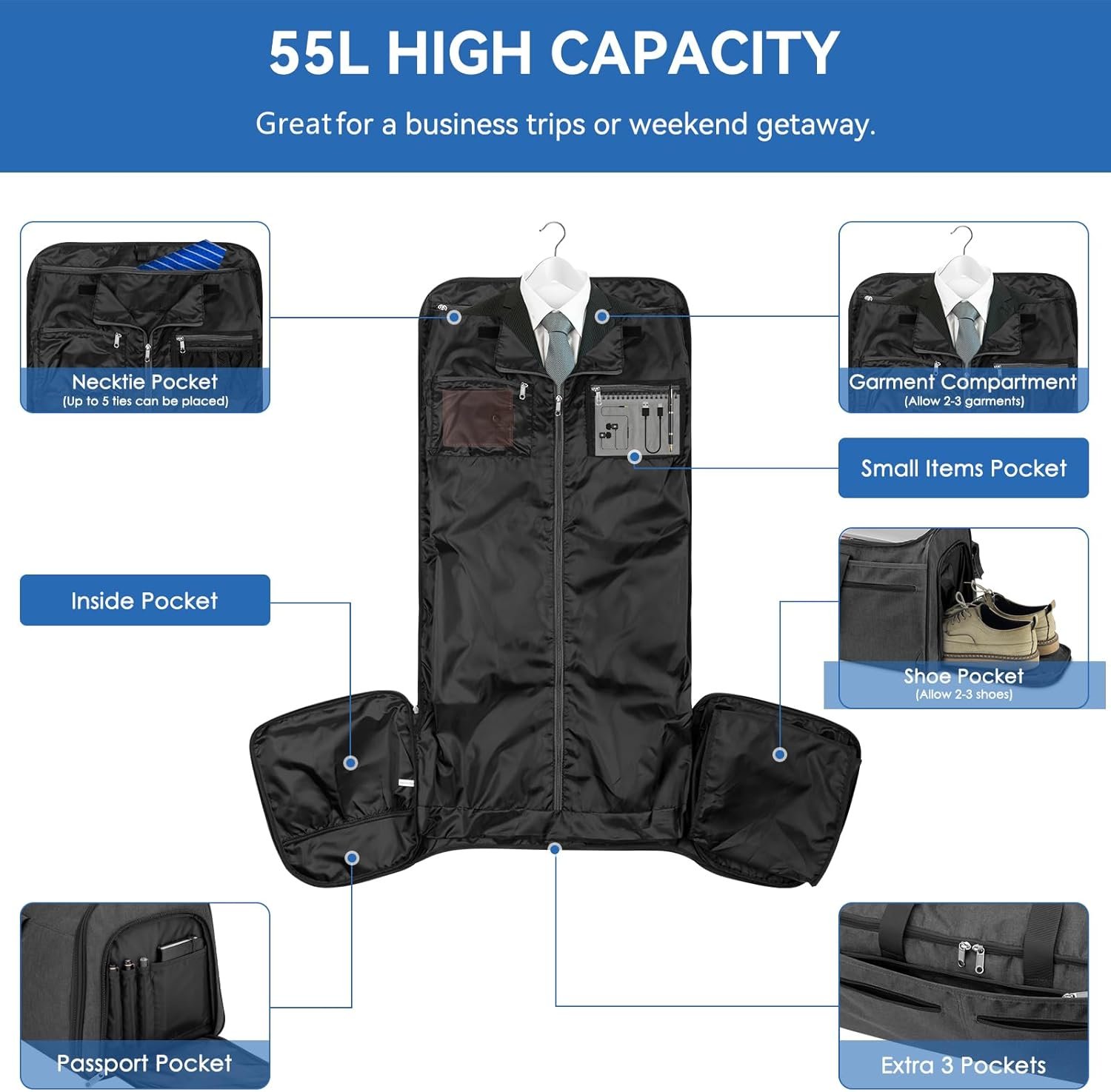 Multifunctional Structure: Our carry on garment bag is designed with 13 compartments, capacity: 55L. With multiple zipper pockets, it maximizes storage capacity, holding everything from suits, dresses, shoes, ties, and other belongings. Also, 4 anti-theft front pockets for your frequently used belongings and provides easy access to electronics and travel or business documents. This garment travel bag has been designed to keep everything you need well-organized on the go.