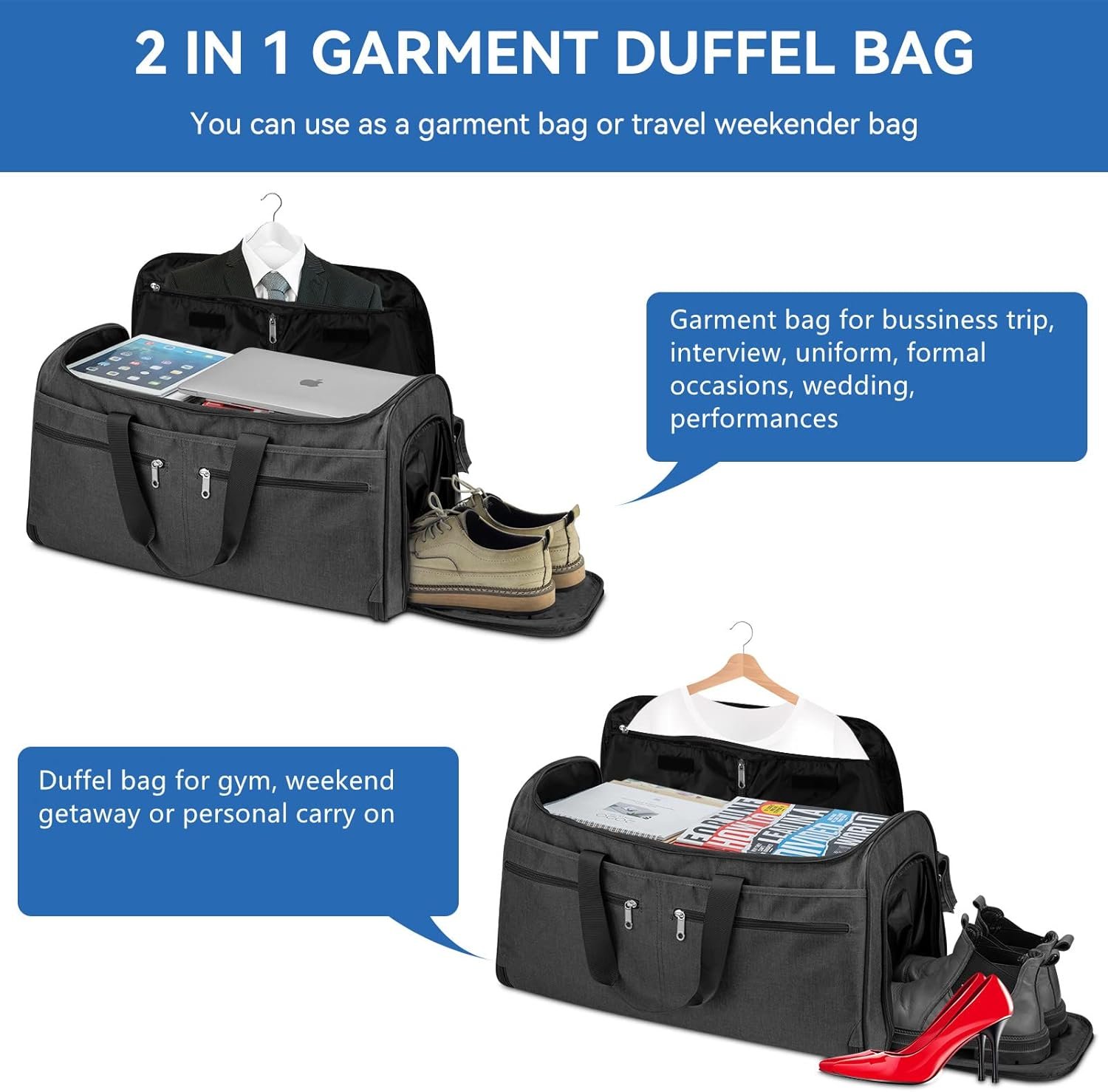 2 in 1 Garment Bag: NEAT & NO WRINKLE. This garment travel bag combines the feature of a garment bag and a travel duffle bag. With extended space and 4 elastic straps to keep your suits and dress neat and no wrinkle for a business trip, It can turn out to be a travel duffle bag for vacation. Ideal for the people who often go for a business trip, formal party, vacation, weekend away, gym, or touring performances.