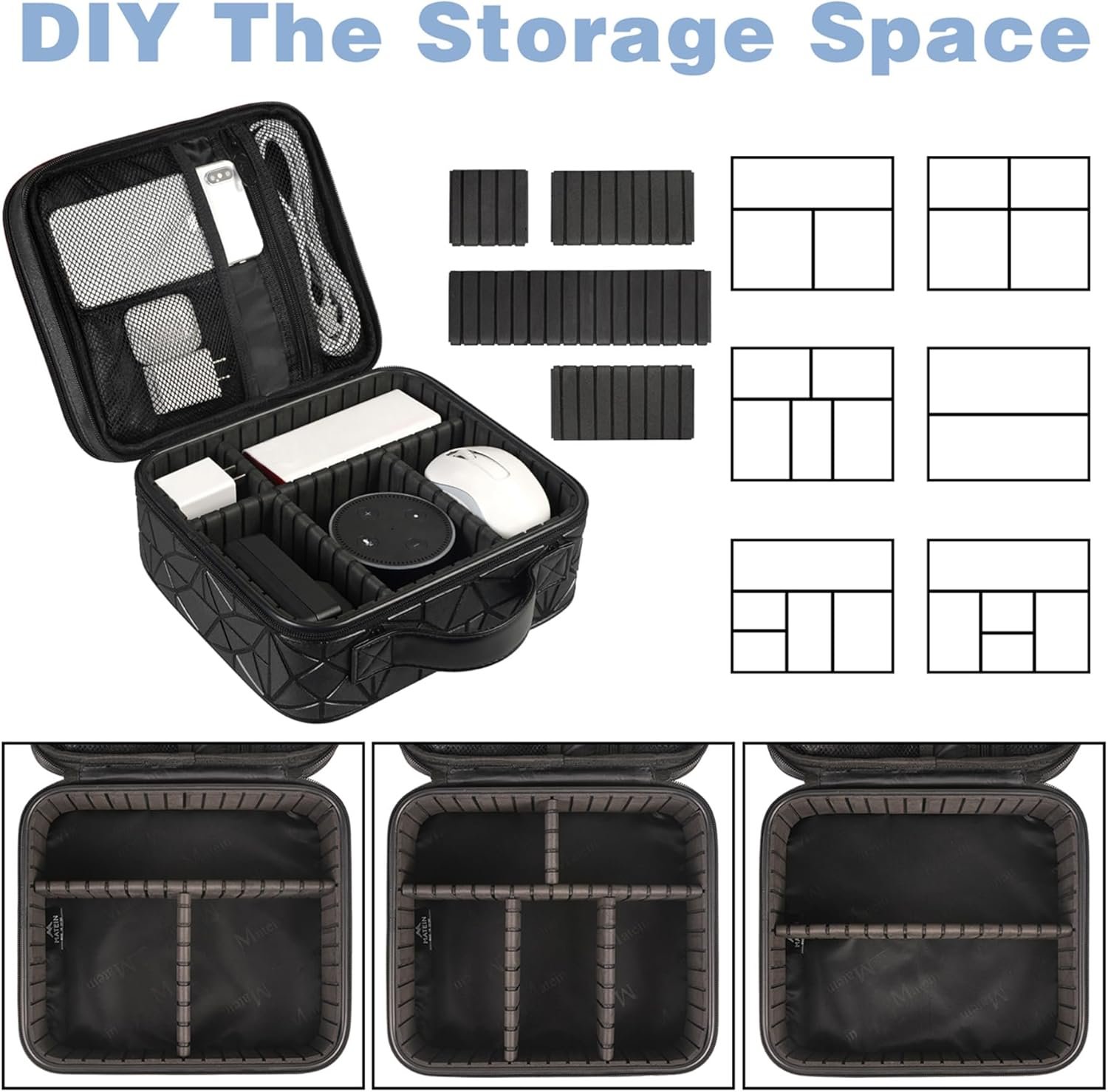 Diy & Large Capacity: This Cable Organizer has an amazing storage space. Four removable strong shock-absorbing partition protect all items inside from scratches, impact and accidental falling. According to your needs, you can easily carry out various items. A variety of design layouts bring unlimited possibilities to your storage space