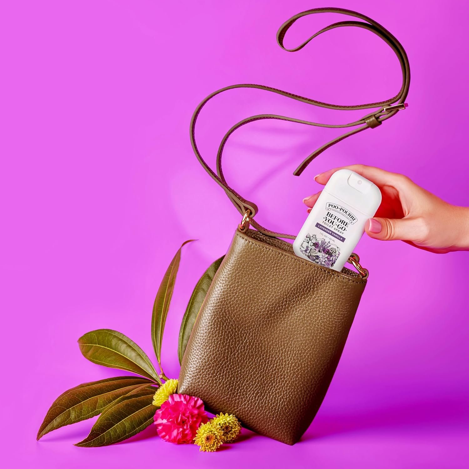 This Poo-Pourri 1 oz. Pocket Travel sprayer is formulated with essential oils and other natural compounds that prevent bathroom odors before they begin! Just spray Poo Pourri into the bowl before-you-go, the proprietary formula creates a protective barrier on the water surface. This barrier is designed to trap unpleasant bathroom odors beneath the surface and keep them out of the air. All you smell is a refreshing bouquet made from Original Citrus, Lavender Vanilla and Tropical Hibiscus!
